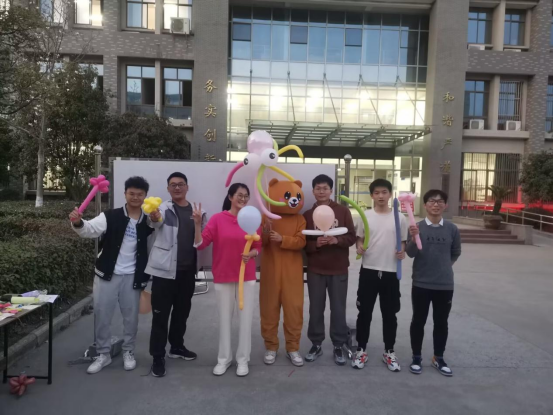 的男生们从上午便开始活动所需的“小礼物”——气球。准备过程中,大家都非常积极,相互配合。一个个气球在他们的手中不断地变换花样,有章鱼,有花朵,还有各种卡通人物。礼物制作完成后,大家率先分别给学院的每一位女辅导员送去一个“小礼物”,在独属于她们的节日里,祝福她们节日快乐。