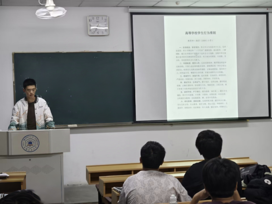 班长带领全体同学集中学习《学生手册》重要章节,主要包括学生行为规定、学生学籍管理实施细则、学业预警与帮扶管理办法、学生资助管理办法、学生违纪处分办法、“第二课堂成绩单”制度实施办法、学生公寓管理办法等内容。会议强调学生手册是学生成长、学风校风建设、班级建设的重要保障,是在校大学生应当熟知并遵守的行为准则,也是学生学习期间的服务指南,每一位同学都要认识到学生手册的重要作用。