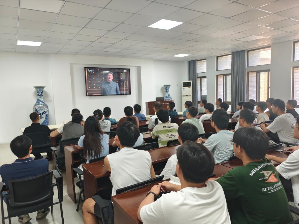 的师生们齐聚在机械楼404报告厅,共同收看纪念中国人民抗日战争暨世界反法西斯战争胜利80周年大会盛况,院领导班子、党委委员、党支部书记以及学生代表等参加了此次活动。