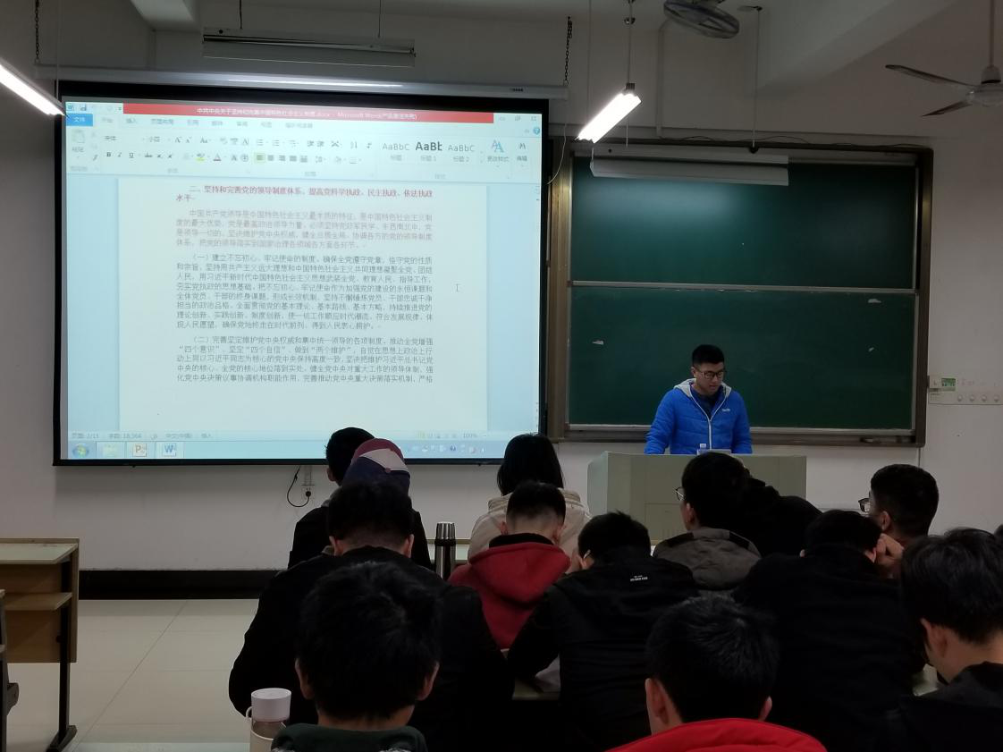 本科生第一党支部在机械楼407教室召开党员大会,专题学习《中共中央关于坚持和完善中国特色社会主义制度 推进国家治理体系和治理能力现代化若干重大问题的决定》。会议由支部书记章军主持,全体学生党员参加会议。