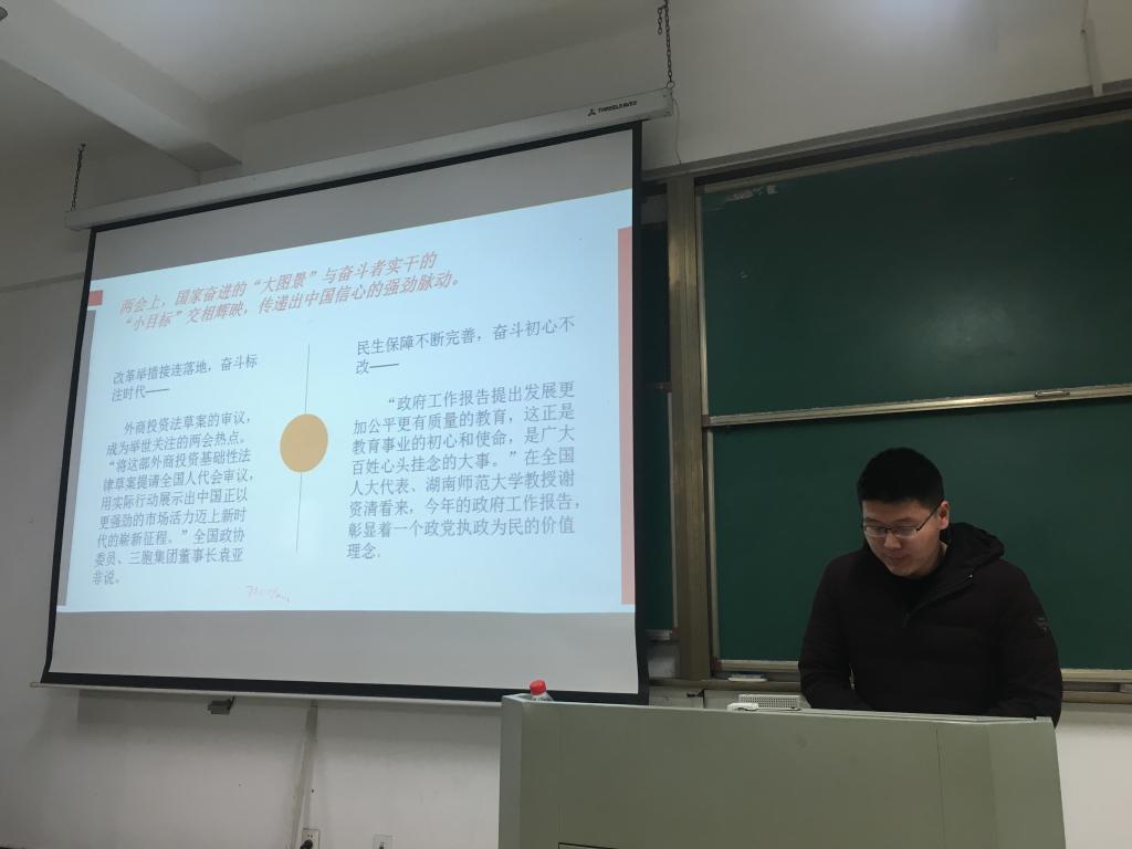 最后,由支部党员第一学习小组带领大家学习了两会期间政府工作报告和习近平主持召开学校思想政治理论课教师座谈会的相关内容,他们指出,党和国家对当代大学生一直非常关心和爱护,作为一名大学生,应始终坚持对马克思主义理论的学习,提高运用这一科学武器分析和解决问题的能力,坚定为祖国和人民矢志奋斗的信念,以实际行动书写无愧于时代的青春篇章。(撰稿:章军 审核:李克明)