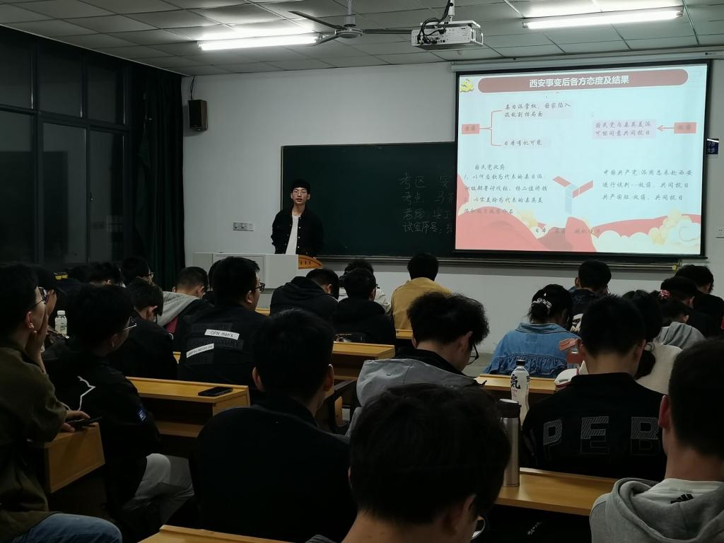 于佳山校区教一514教室举行了“学史爱党,知史爱国”红色宣讲团巡回宣讲第二场,由毕业生党员、红色宣讲团第二组主讲人周大庆为同学们宣讲“由国内战争走向抗日民族战争的转折点——西安事变”。