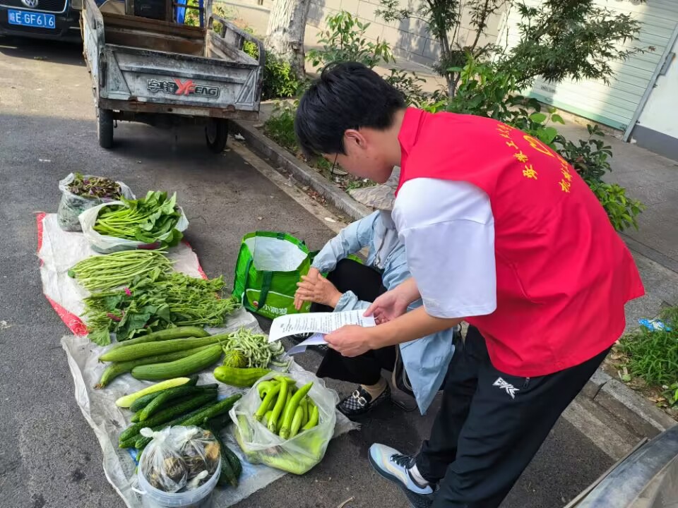 图为实践队员向路边商贩介绍防暑内容