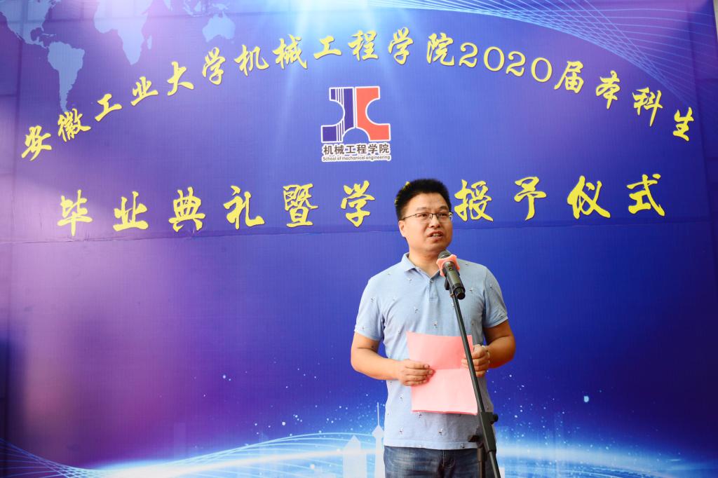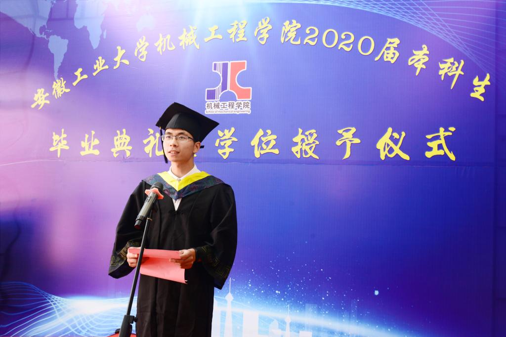 典礼上,2020届毕业生代表车辆工程专业徐汉波与教师代表2016级辅导员董春辉依次发言,回忆四年来的点点滴滴。