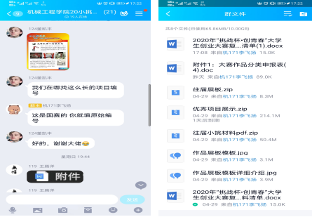 2020小挑复赛”QQ群,及时将赛事变动要求及复赛准备材料清单、参考材料等上传群文件,供复赛团队参考。同时,督促复赛团队积极联系指导老师,我院专业教师利用五一假期积极指导各团队完善比赛资料。