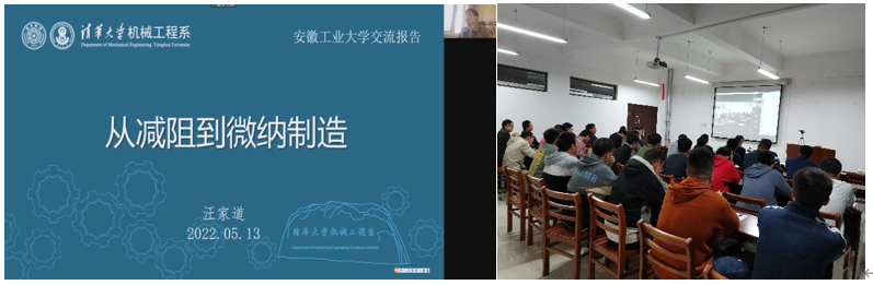 汪家道教授首先对机械工程的产业和人才需求进行简要分析,然后着重介绍课题组从基础研究、关键技术到结合产业需求的研发历程,分享了气固界面微旋涡、水下微气泡等减阻关键技术及其在自行车、冬奥项目等减阻方面获得了成功应用。同时,汪家道教授还分享了胶体颗粒自组装方法作用的一种新型微纳制造方法,介绍了该方法在新型功能涂层制备、新材料、细胞转染及柔性曲面电路制造等方面取得最新进展。报告结束后,汪家道教授和与会师生进行了积极交流互动,认真详细地回答了师生的问题。报告开拓了与会师生的视野,促进深入思考研究,指引了努力方向,与会师生纷纷表示受益匪浅。