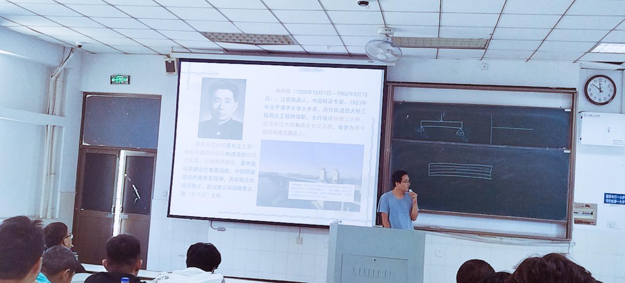 课堂教学过程中,汪浩老师结合南京长江大桥的建造历史背景与新中国桥梁建设奠基人梅旸春的先进个人事迹,鼓励学生发扬不畏苦难、艰苦奋斗、勇于挑战、敢于创新的大国工匠精神,激励学生在新时代背景下,珍惜来之不易的生活和学习条件,学好工程力学,打下扎实的基础,为将来发展先进技术,实现工业强国做出应有的贡献。
