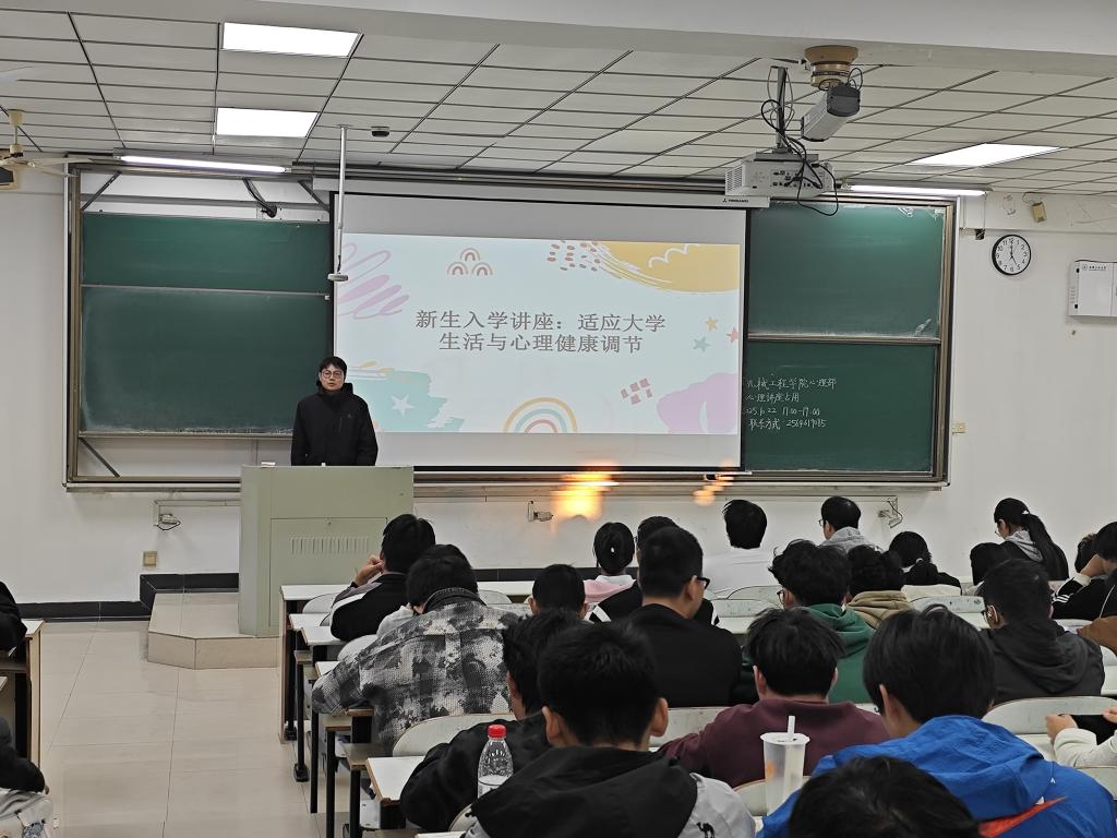 的基本情况与发展历程,帮助新生进一步加深对校园环境与学院文化的了解。随后,彭老师围绕心理健康相关知识展开讲解,内容涵盖情绪调节方法、积极心态培养、压力应对策略等,引导同学们关注自我心理状态,增强心理韧性。最后,彭老师勉励大家以乐观自信的态度迎接大学生活中的各类挑战,在探索与成长中书写精彩的青春篇章。