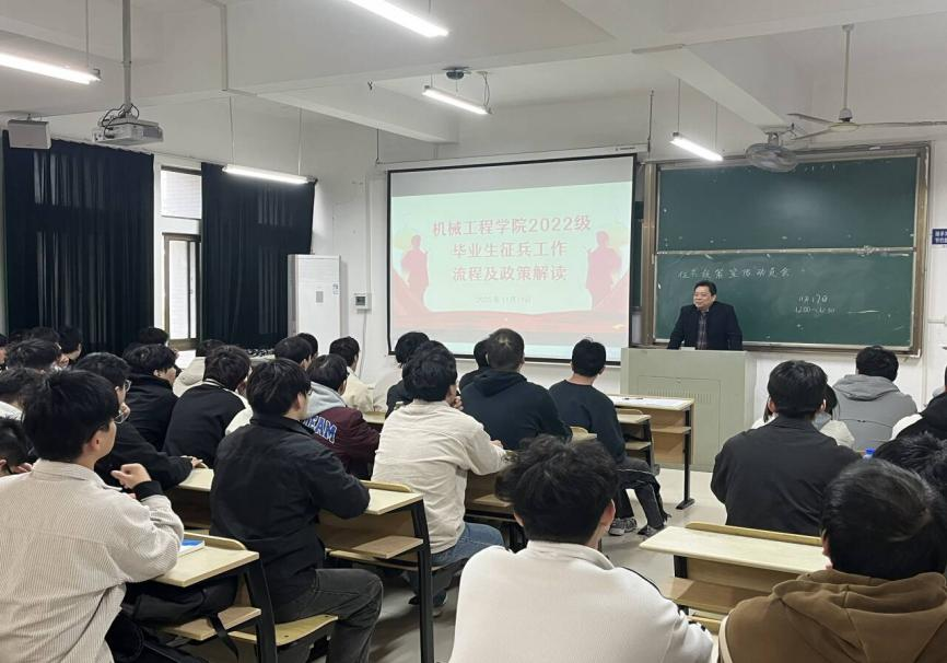 在机械楼405召开毕业生征兵宣传动员会。学院党委副书记、副院长陈庆林、辅导员孙紫玮以及2026届毕业生代表参加会议。